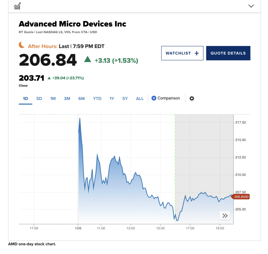 ข่าวดีลนี้ทำให้หุ้น AMD พุ่งขึ้นทันที 24% สู่ระดับ 203.71 ดอลลาร์ต่อหุ้น หลังประกาศข้อตกลง โดยในบางตลาดมีรายงานว่าพุ่งสูงสุดถึง 34–35% ภายในวันเดียว ซึ่งเป็นการปรับตัวที่รุนแรงที่สุดของบริษัทในรอบหลายปี