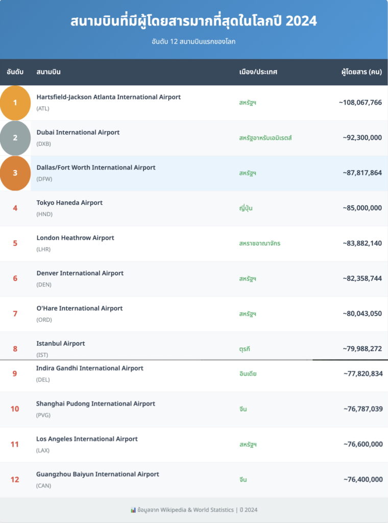 สนามบินสุวรรณภูมิของไทยในปี 2025 ยังเป็นสนามบินที่มีสายการบินให้บริการมากที่สุดในโลกถึง 113 สายการบิน และเป็นสนามบินที่ได้รับการจัดอันดับที่ 39 ในโลกในด้านคุณภาพและประสบการณ์ผู้โดยสาร