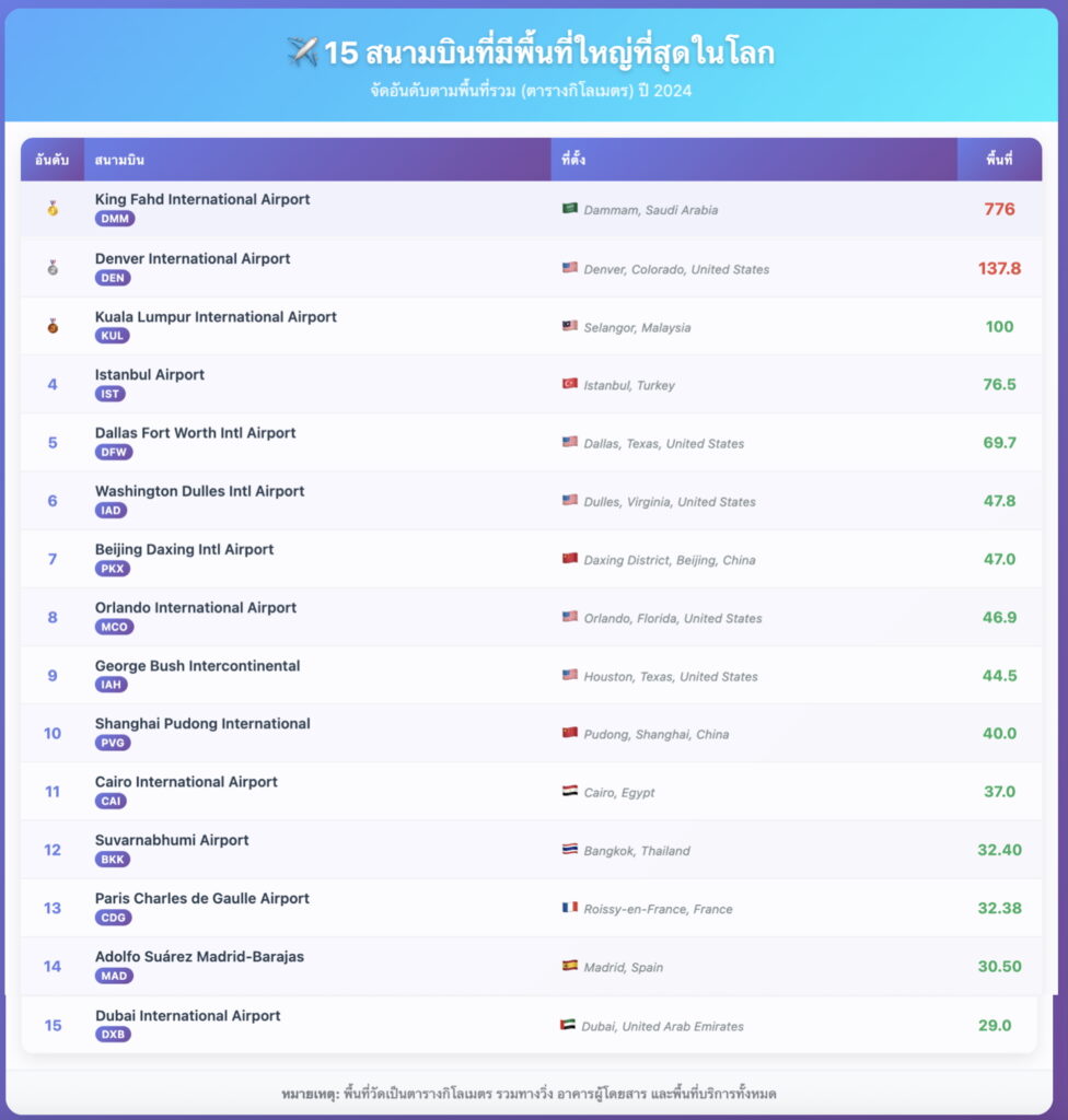 หากจะเทียบกับสนามบินสุวรรณภูมิของเรา World Atlas.com ระบุว่ามีพื้นที่ขนาด 3,240 เฮกตาร์หรือประมาณ 32.4 ตารางกิโลกเมตร หรอืแม้แต่สนามบินดอนเมือง มีพื้นที่ขนาด 2,960 เฮกตาร์หรือ 29.6 ตารางกิโลเมตร